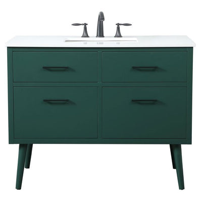 Delve into a world of minimalistic fashion and contemporary styling with this midcentury modern 42" vanity. The clean lines anchors the design, while the oblique tapered cylinder legs add subtle interest. However, the artful juxtaposition between the green and white creates a blend of bright modernity and classical traditions. A black handle adorns the top fake drawer hiding the base of the integrated porcelain sink while another one allows you to pull the bottom drawer out, letting you store your bathroom necessities and toiletries. The compact size makes it the perfect vanity for any bathroom or powder room, regardless of size.