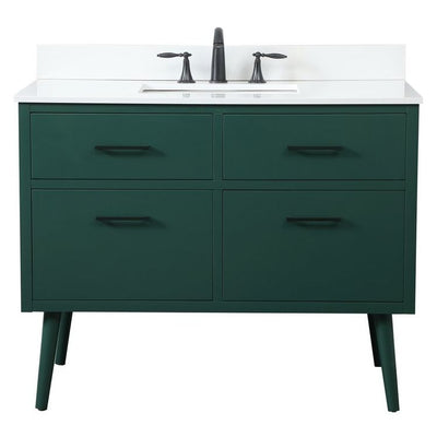 Delve into a world of minimalistic fashion and contemporary styling with this midcentury modern 42" vanity. The clean lines anchors the design, while the oblique tapered cylinder legs add subtle interest. However, the artful juxtaposition between the blue and white top creates a blend of bright modernity and classical traditions. A gold handle adorns the top fake drawer hiding the base of the integrated porcelain sink while another one allows you to pull the bottom drawer out, letting you store your bathroom necessities and toiletries. The compact size makes it the perfect vanity for any bathroom or powder room, regardless of size. Comes with a matching backsplash to complete the look and protects your wall.
