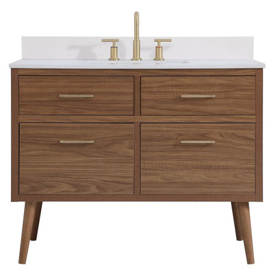 Delve into a world of minimalistic fashion and contemporary styling with this midcentury modern 42" vanity. The clean lines anchors the design, while the oblique tapered cylinder legs add subtle interest. However, the artful juxtaposition between the walnut brown and matte white creates a blend of bright modernity and classical traditions. A gold handle adorns the top fake drawer hiding the base of the integrated porcelain sink while another one allows you to pull the bottom drawer out, letting you store your bathroom necessities and toiletries. The compact size makes it the perfect vanity for any bathroom or powder room, regardless of size. Comes with a matching backsplash to complete the look and protects your wall.