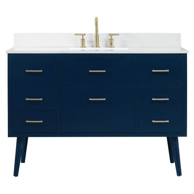 Delve into a world of minimalistic fashion and contemporary styling with this midcentury modern 48" vanity. The clean lines anchors the design, while the oblique tapered cylinder legs add subtle interest. However, the artful juxtaposition between the blue and white top creates a blend of bright modernity and classical traditions. A gold handle adorns the top fake drawer hiding the base of the integrated porcelain sink while another one allows you to pull the bottom drawer out, letting you store your bathroom necessities and toiletries. The compact size makes it the perfect vanity for any bathroom or powder room, regardless of size. Comes with a matching backsplash to complete the look and protects your wall.