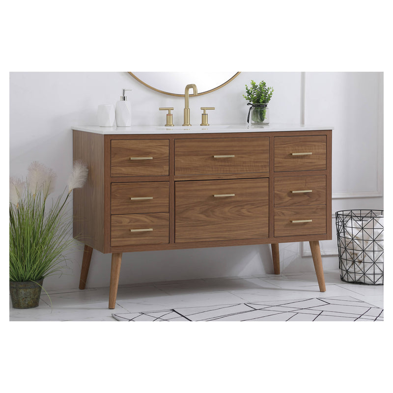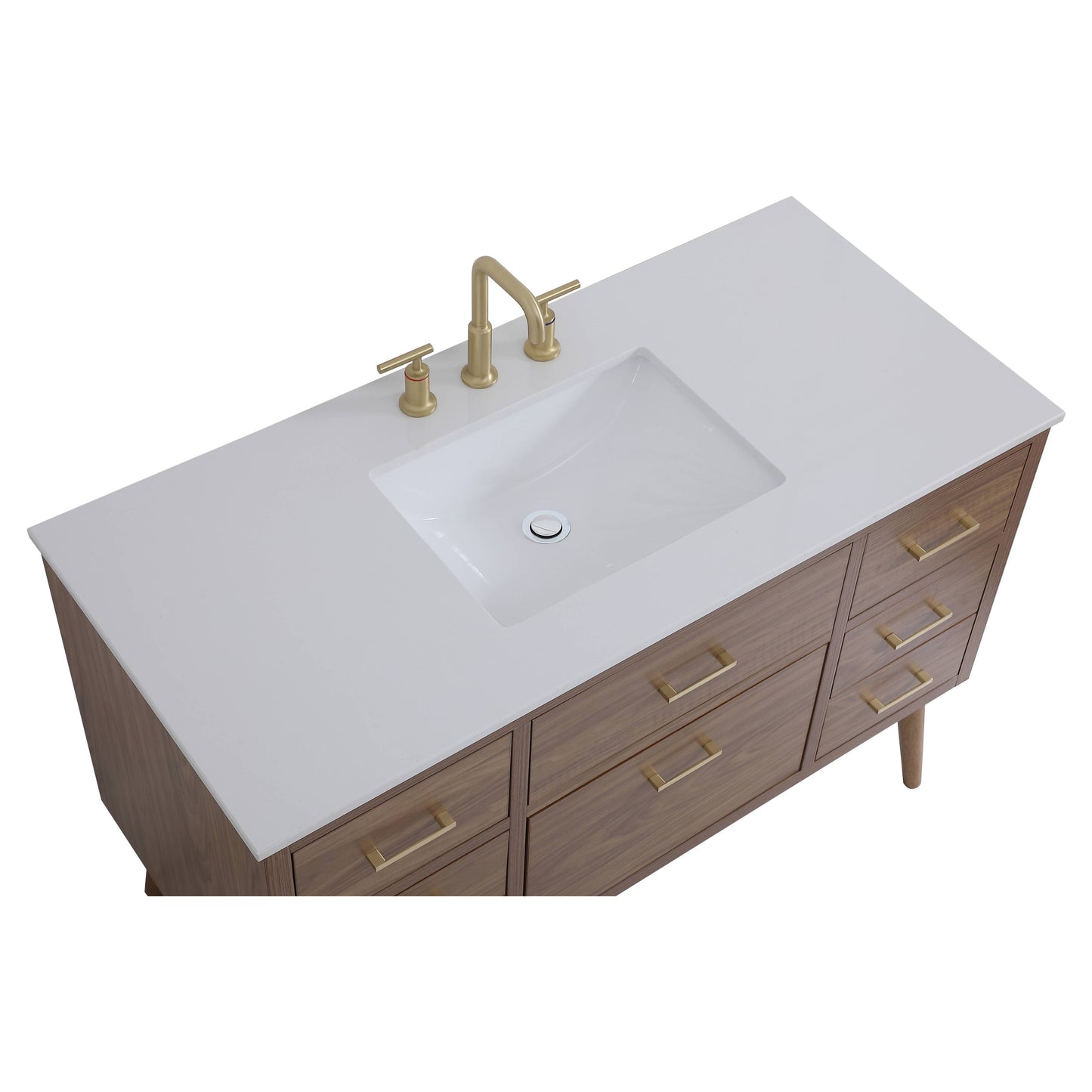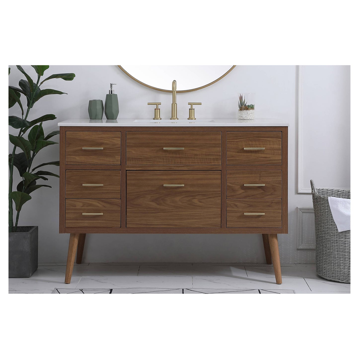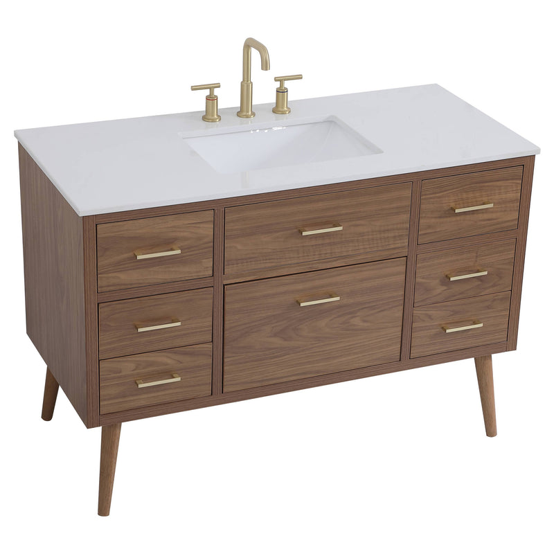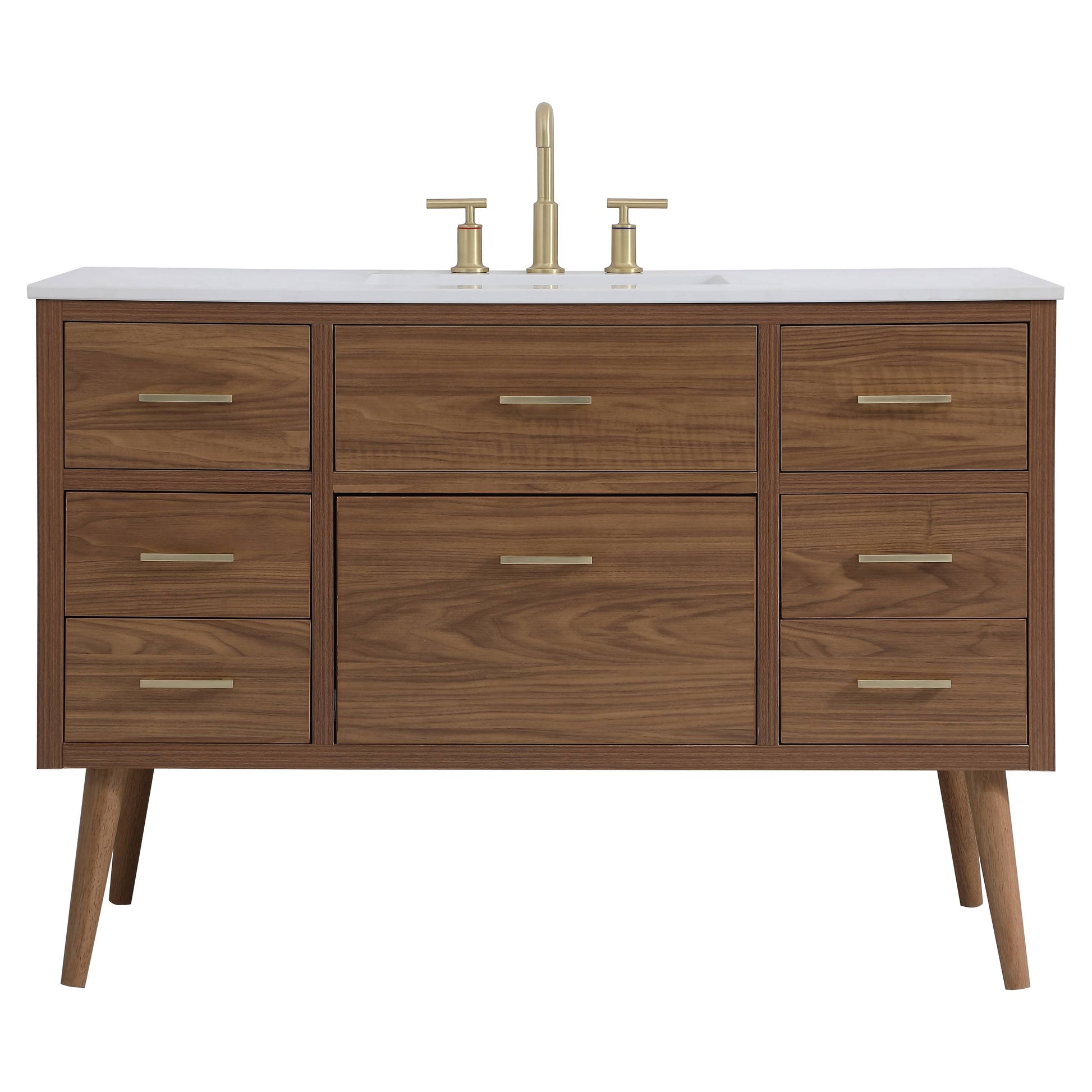 Delve into a world of minimalistic fashion and contemporary styling with this midcentury modern 48" vanity. The clean lines anchors the design, while the oblique tapered cylinder legs add subtle interest. However, the artful juxtaposition between the walnut brown and matte white creates a blend of bright modernity and classical traditions. A gold handle adorns the top fake drawer hiding the base of the integrated porcelain sink while another one allows you to pull the bottom drawer out, letting you store your bathroom necessities and toiletries. The compact size makes it the perfect vanity for any bathroom or powder room, regardless of size.