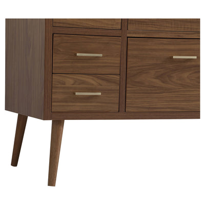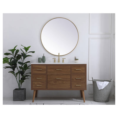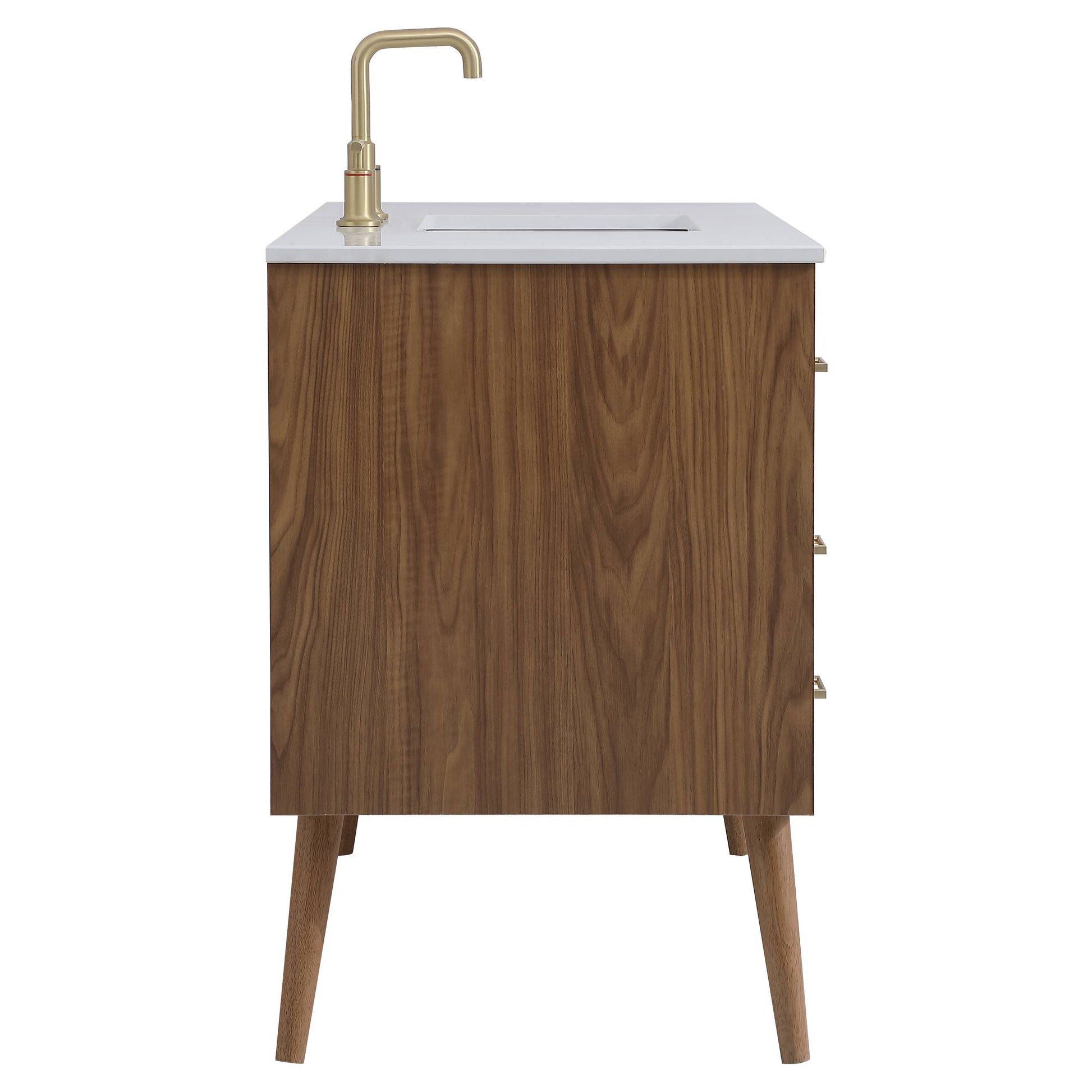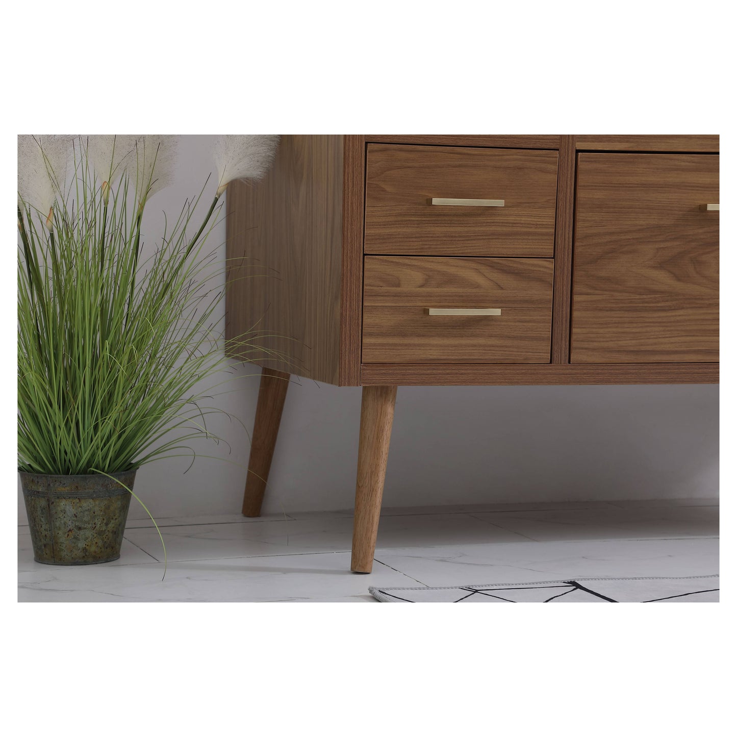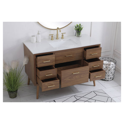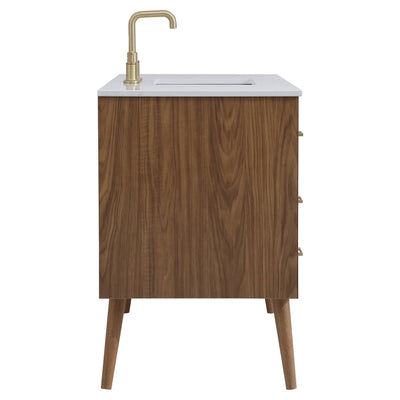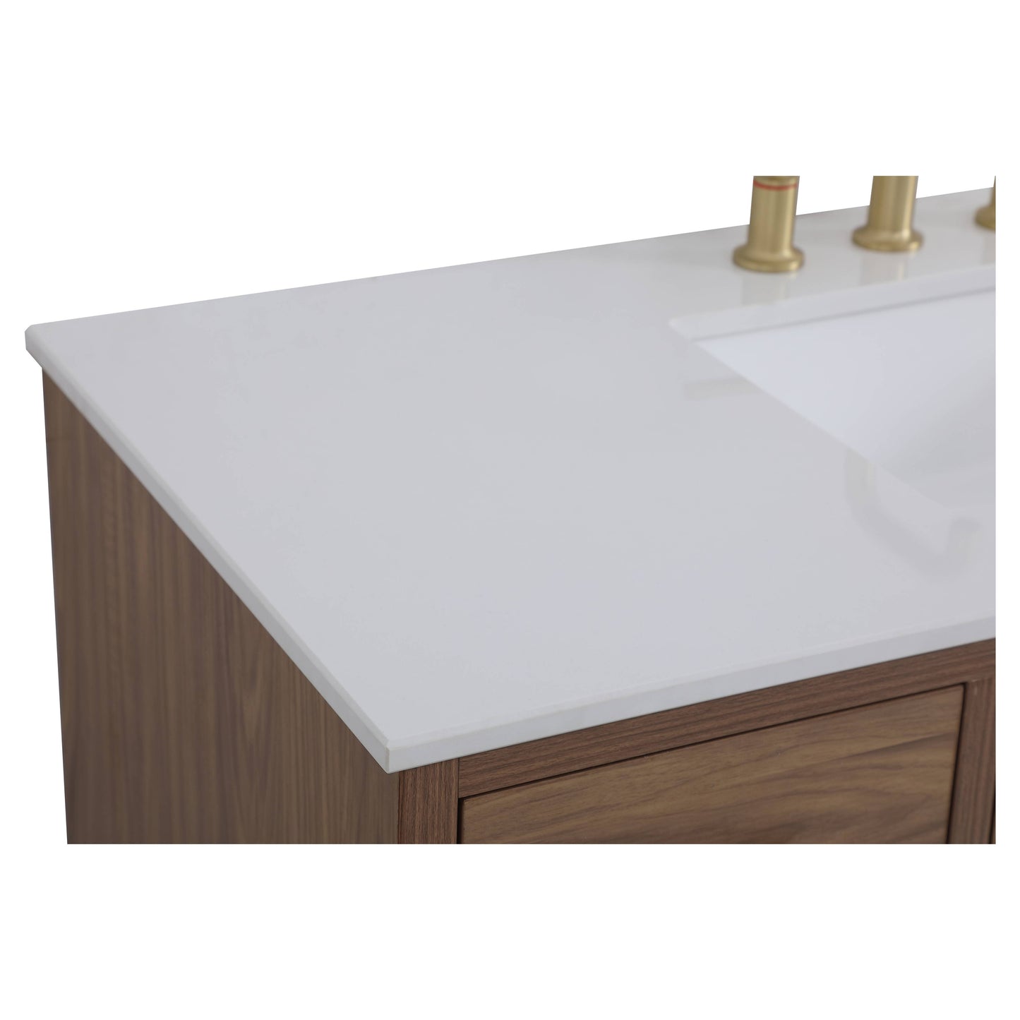 Delve into a world of minimalistic fashion and contemporary styling with this midcentury modern 48" vanity. The clean lines anchors the design, while the oblique tapered cylinder legs add subtle interest. However, the artful juxtaposition between the walnut brown and matte white creates a blend of bright modernity and classical traditions. A gold handle adorns the top fake drawer hiding the base of the integrated porcelain sink while another one allows you to pull the bottom drawer out, letting you store your bathroom necessities and toiletries. The compact size makes it the perfect vanity for any bathroom or powder room, regardless of size.