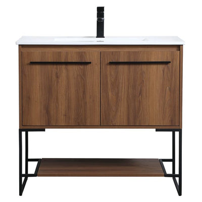 Live in modern comfort with this 36" walnut brown finish vanity. Dressed in a concrete grey and sleek black metal hardware, its contemporary style will have your bathroom or powder room elevated in industrial sophistication. The open shelf at the base and two doors reveal ample storage space for your bathroom essentials and miscellany. Clean lines create its own visual interest, adding trendy looks to your already chic room.