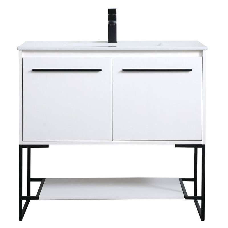 Live in modern comfort with this 36" white finish vanity. Dressed in a concrete grey and sleek black metal hardware, its contemporary style will have your bathroom or powder room elevated in industrial sophistication. The open shelf at the base and two doors reveal ample storage space for your bathroom essentials and miscellany. Clean lines create its own visual interest, adding trendy looks to your already chic room.