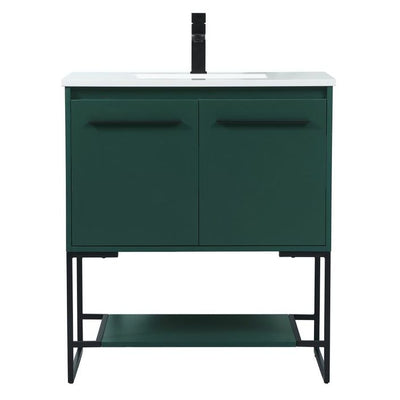Live in modern comfort with this 30" green finish vanity. Dressed in a green and sleek black metal hardware, its contemporary style will have your bathroom or powder room elevated in industrial sophistication. The open shelf at the base and two doors reveal ample storage space for your bathroom essentials and miscellany. Clean lines create its own visual interest, adding trendy looks to your already chic room.
