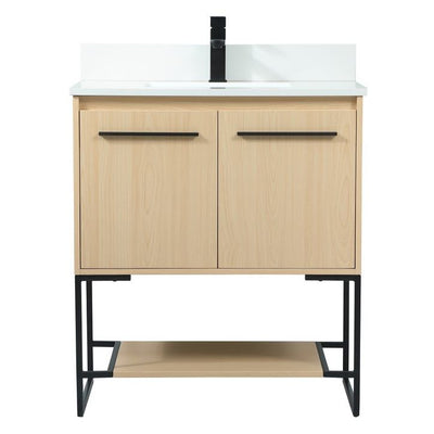 Live in modern comfort with this 30" maple finish vanity. Dressed in a maple and sleek black metal hardware, its contemporary style will have your bathroom or powder room elevated in industrial sophistication. The open shelf at the base and two doors reveal ample storage space for your bathroom essentials and miscellany. Clean lines create its own visual interest, adding trendy looks to your already chic room. Comes with a matching backsplash to complete the look and protects your wall.