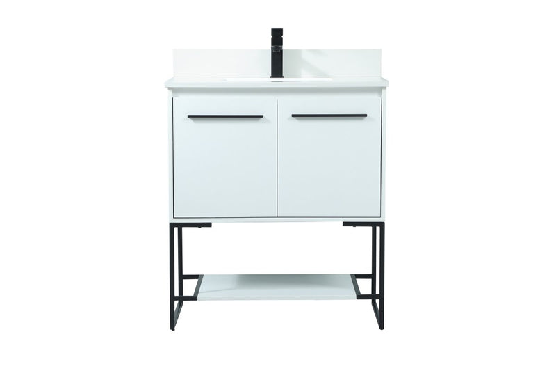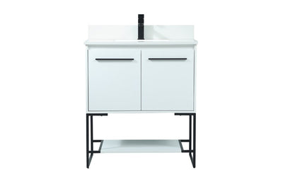 Live in modern comfort with this 30" white finish vanity. Dressed in a white and sleek black metal hardware, its contemporary style will have your bathroom or powder room elevated in industrial sophistication. The open shelf at the base and two doors reveal ample storage space for your bathroom essentials and miscellany. Clean lines create its own visual interest, adding trendy looks to your already chic room. Comes with a matching backsplash to complete the look and protects your wall.