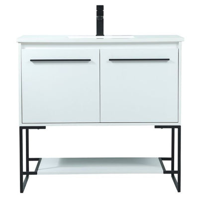 Live in modern comfort with this 36" white finish vanity. Dressed in a white and sleek black metal hardware, its contemporary style will have your bathroom or powder room elevated in industrial sophistication. The open shelf at the base and two doors reveal ample storage space for your bathroom essentials and miscellany. Clean lines create its own visual interest, adding trendy looks to your already chic room.