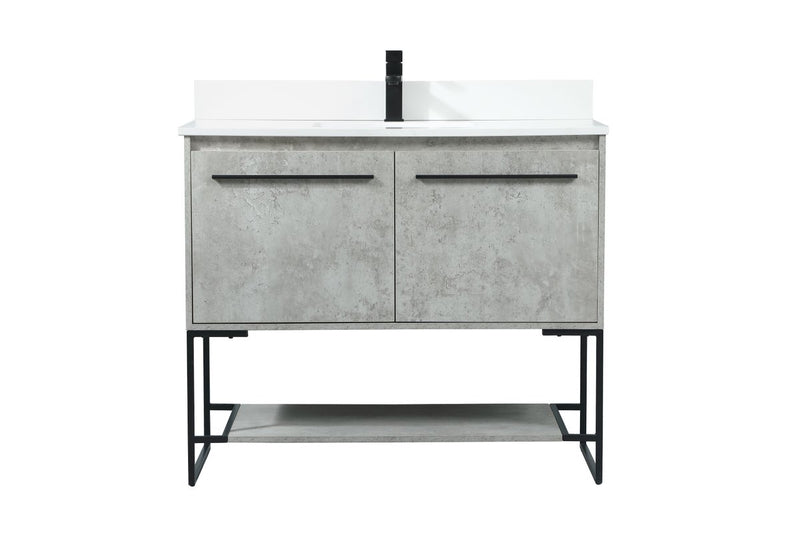 Live in modern comfort with this 40" concrete grey finish vanity. Dressed in a concrete grey and sleek black metal hardware, its contemporary style will have your bathroom or powder room elevated in industrial sophistication. The open shelf at the base and two doors reveal ample storage space for your bathroom essentials and miscellany. Clean lines create its own visual interest, adding trendy looks to your already chic room. Comes with a matching backsplash to complete the look and protects your wall.
