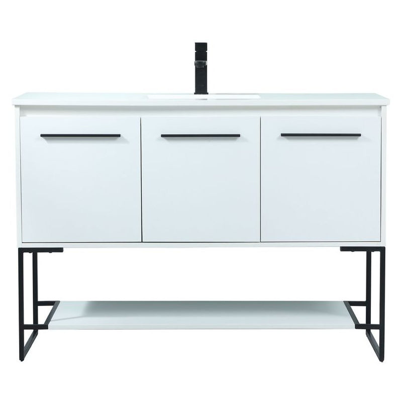 Live in modern comfort with this 48" white finish vanity. Dressed in a white and sleek black metal hardware, its contemporary style will have your bathroom or powder room elevated in industrial sophistication. The open shelf at the base and three doors reveal ample storage space for your bathroom essentials and miscellany. Clean lines create its own visual interest, adding trendy looks to your already chic room.