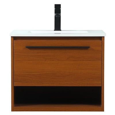 Save space and make your bathroom appear bigger with this floating vanity. Its minimal design will have you in awe, while its clean lines will leave your room feeling fresh and uncluttered. The single u-drawer pulls out for storage while the open space below allows you to place extra towels or various other essentials. The ivory white quartz counter top with porcelain sink adds refined luxe while the aluminum barpull style handle adorn the vanity face.