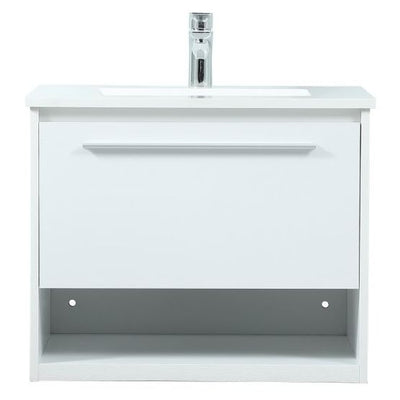 Save space and make your bathroom appear bigger with this floating vanity. Its minimal design will have you in awe, while its clean lines will leave your room feeling fresh and uncluttered. The single u-drawer pulls out for storage while the open space below allows you to place extra towels or various other essentials. The ivory white quartz counter top with porcelain sink adds refined luxe while the aluminum barpull style handle adorn the vanity face.