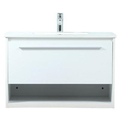 Save space and make your bathroom appear bigger with this floating vanity. Its minimal design will have you in awe, while its clean lines will leave your room feeling fresh and uncluttered. The single u-drawer pulls out for storage while the open space below allows you to place extra towels or various other essentials. The ivory white quartz counter top with porcelain sink adds refined luxe while the aluminum barpull style handle adorn the vanity face.