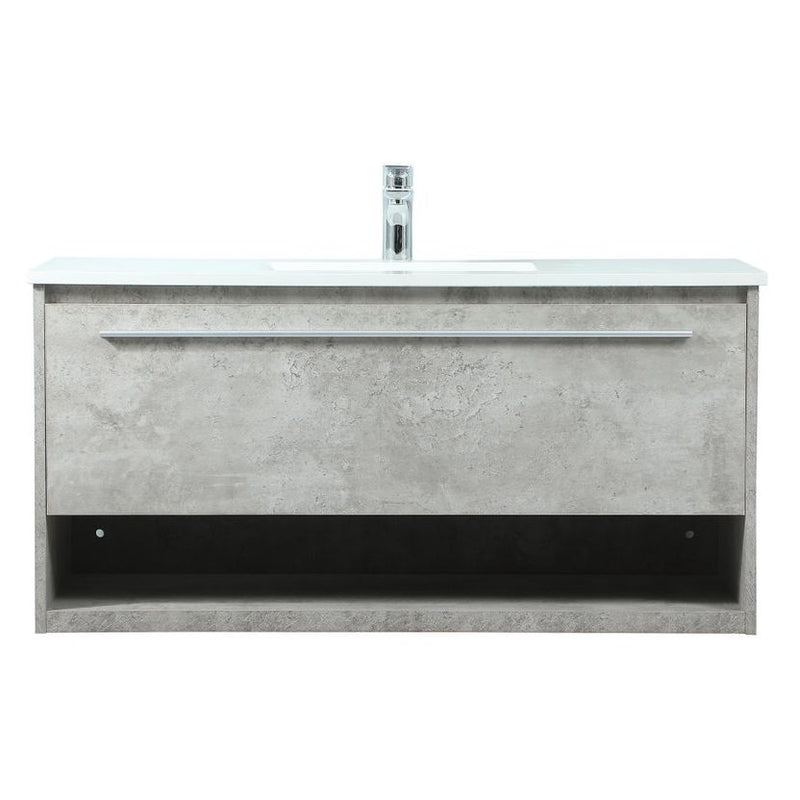 Save space and make your bathroom appear bigger with this floating vanity. Its minimal design will have you in awe, while its clean lines will leave your room feeling fresh and uncluttered. The single u-drawer pulls out for storage while the open space below allows you to place extra towels or various other essentials. The ivory white quartz counter top with porcelain sink adds refined luxe while the aluminum barpull style handle adorn the vanity face.