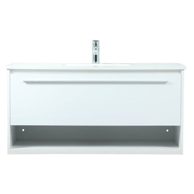 Save space and make your bathroom appear bigger with this floating vanity. Its minimal design will have you in awe, while its clean lines will leave your room feeling fresh and uncluttered. The single u-drawer pulls out for storage while the open space below allows you to place extra towels or various other essentials. The ivory white quartz counter top with porcelain sink adds refined luxe while the aluminum barpull style handle adorn the vanity face.