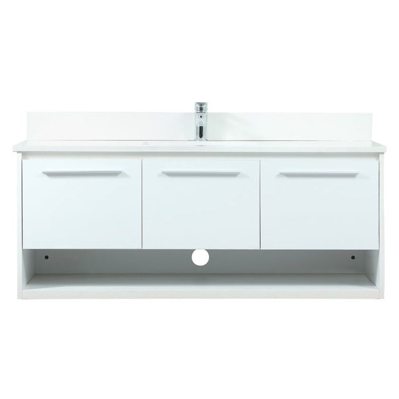 Save space and make your bathroom appear bigger with this floating vanity. Its minimal design will have you in awe, while its clean lines will leave your room feeling fresh and uncluttered. The single u-drawer pulls out for storage while the open space below allows you to place extra towels or various other essentials. The ivory white quartz counter top with porcelain sink adds refined luxe while the aluminum barpull style handle adorn the vanity face. Comes with a matching backsplash to protect your walls.