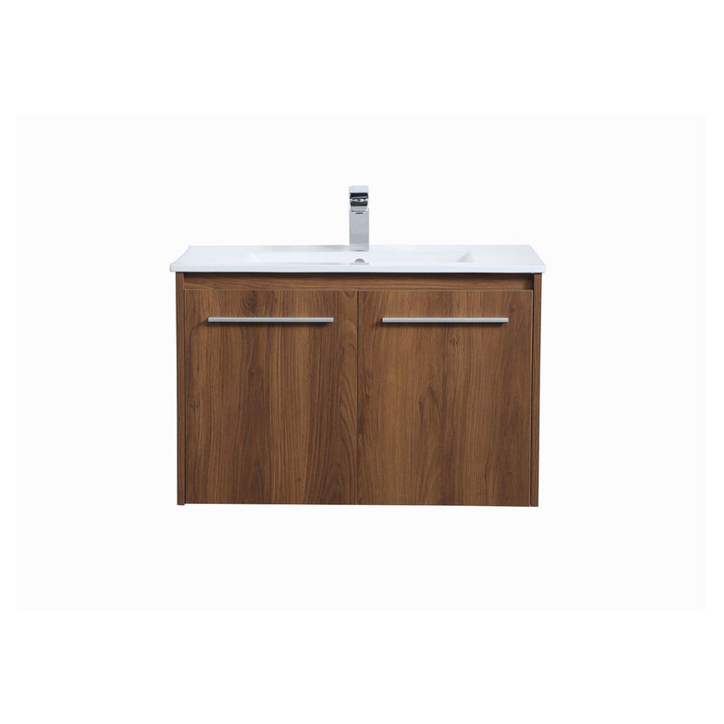 The contemporary simplicity of this 30" floating vanity in a walnut brown finish will help open the space and add stunning modern flair to your bathroom or powder room. The open space below makes it easy to show off your tiles and to clean the floor with ease--it's also the perfect place for a hamper. Double doors open to reveal plentiful of storage pace to store all of your bathroom miscellany. The clean lines that permeate through the design will surely create a fresh look in your home.