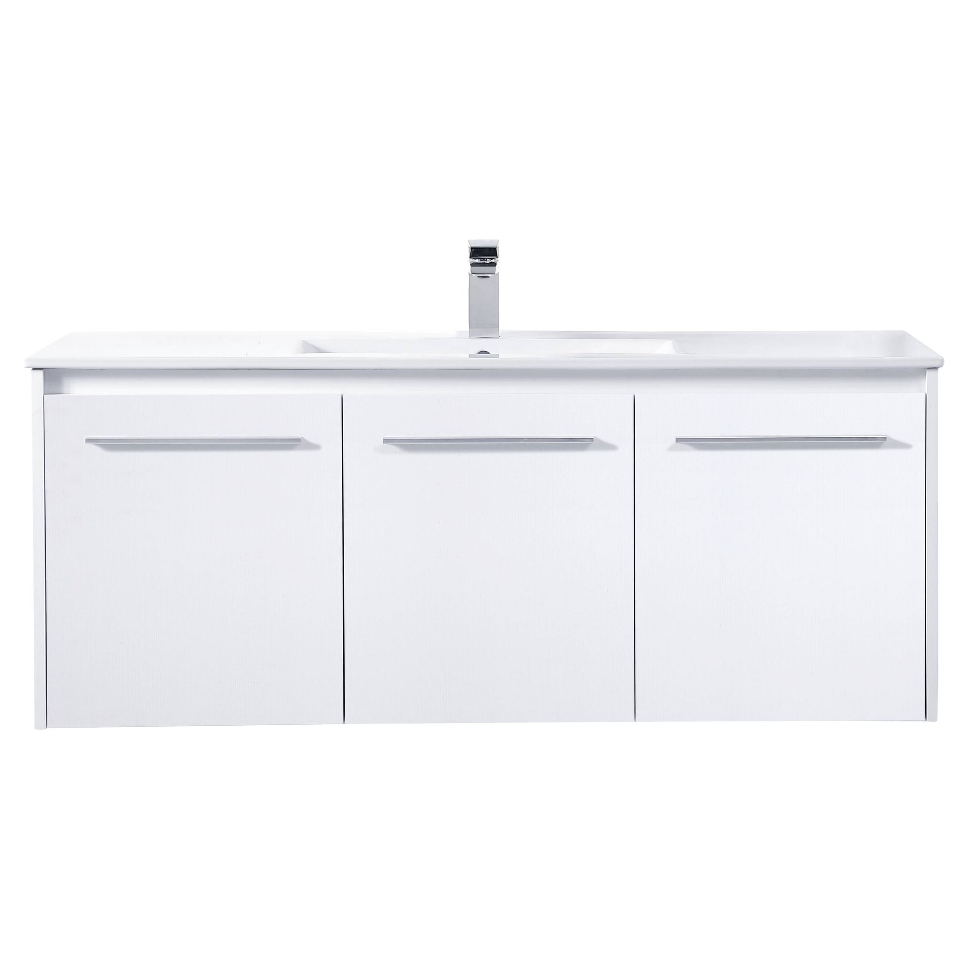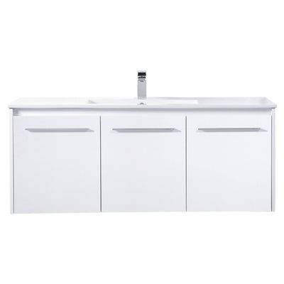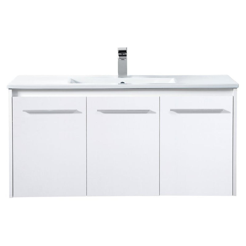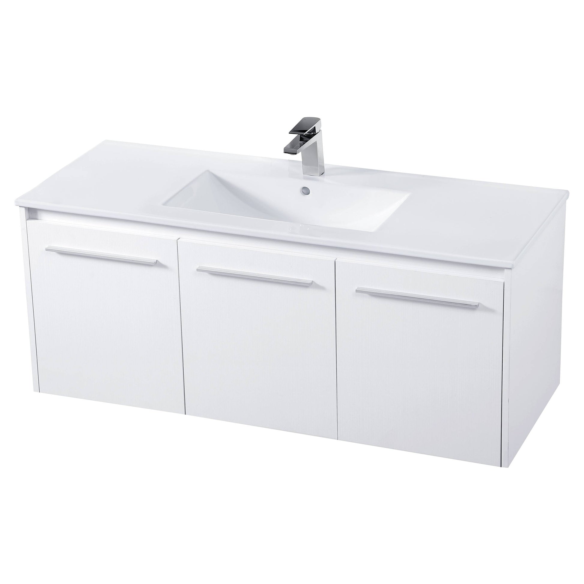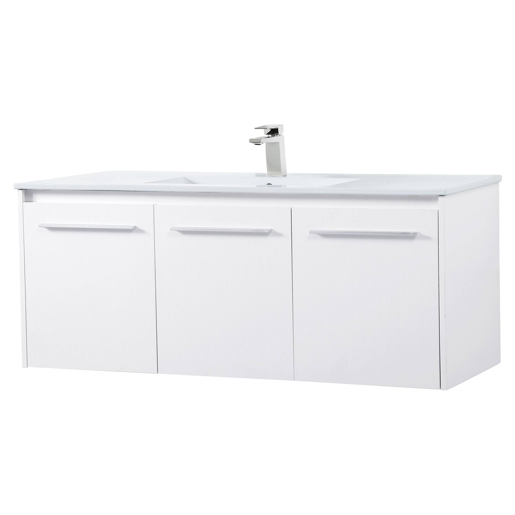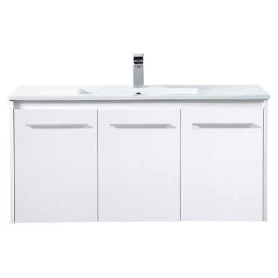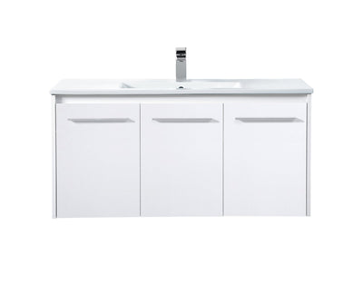 The contemporary simplicity of this 40" floating vanity in a white finish will help open the space and add stunning modern flair to your bathroom or powder room. The open space below makes it easy to show off your tiles and to clean the floor with ease--it's also the perfect place for a hamper. 3 doors open to reveal plentiful of storage pace to store all of your bathroom miscellany. The clean lines that permeate through the design will surely create a fresh look in your home.