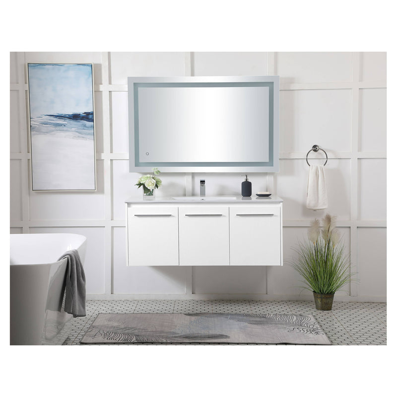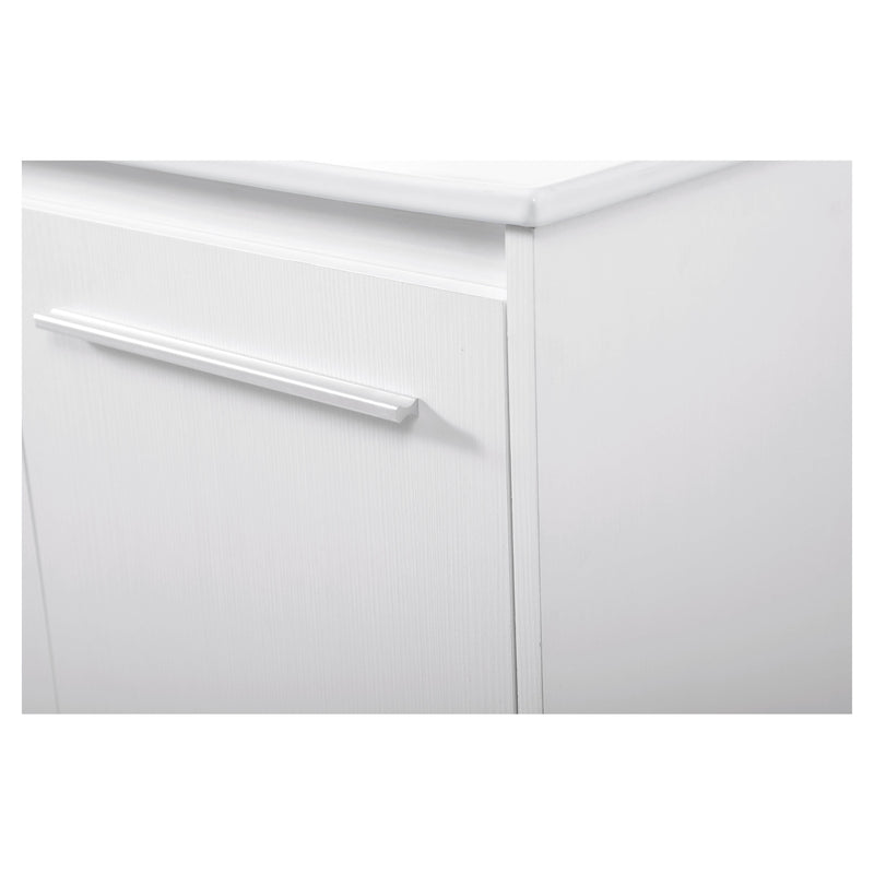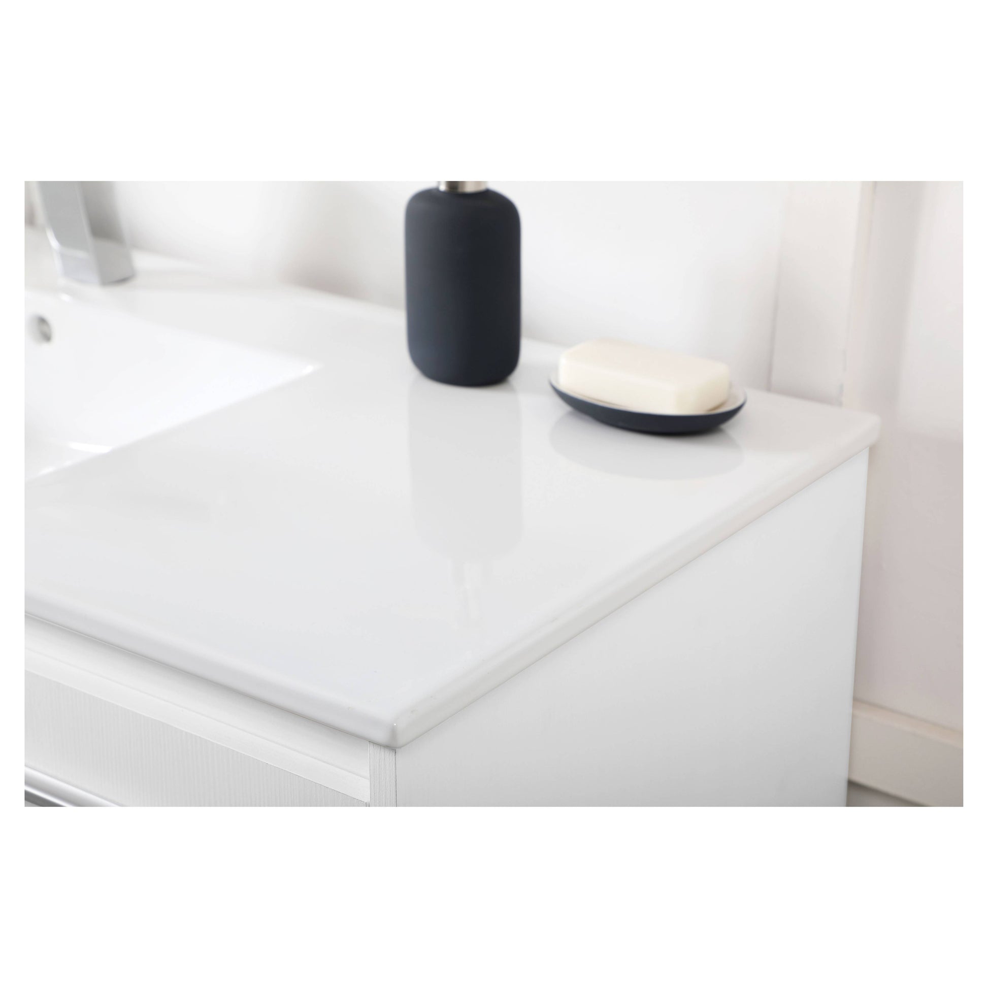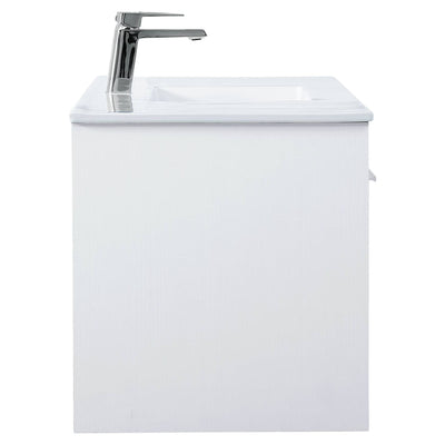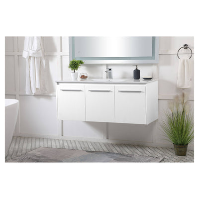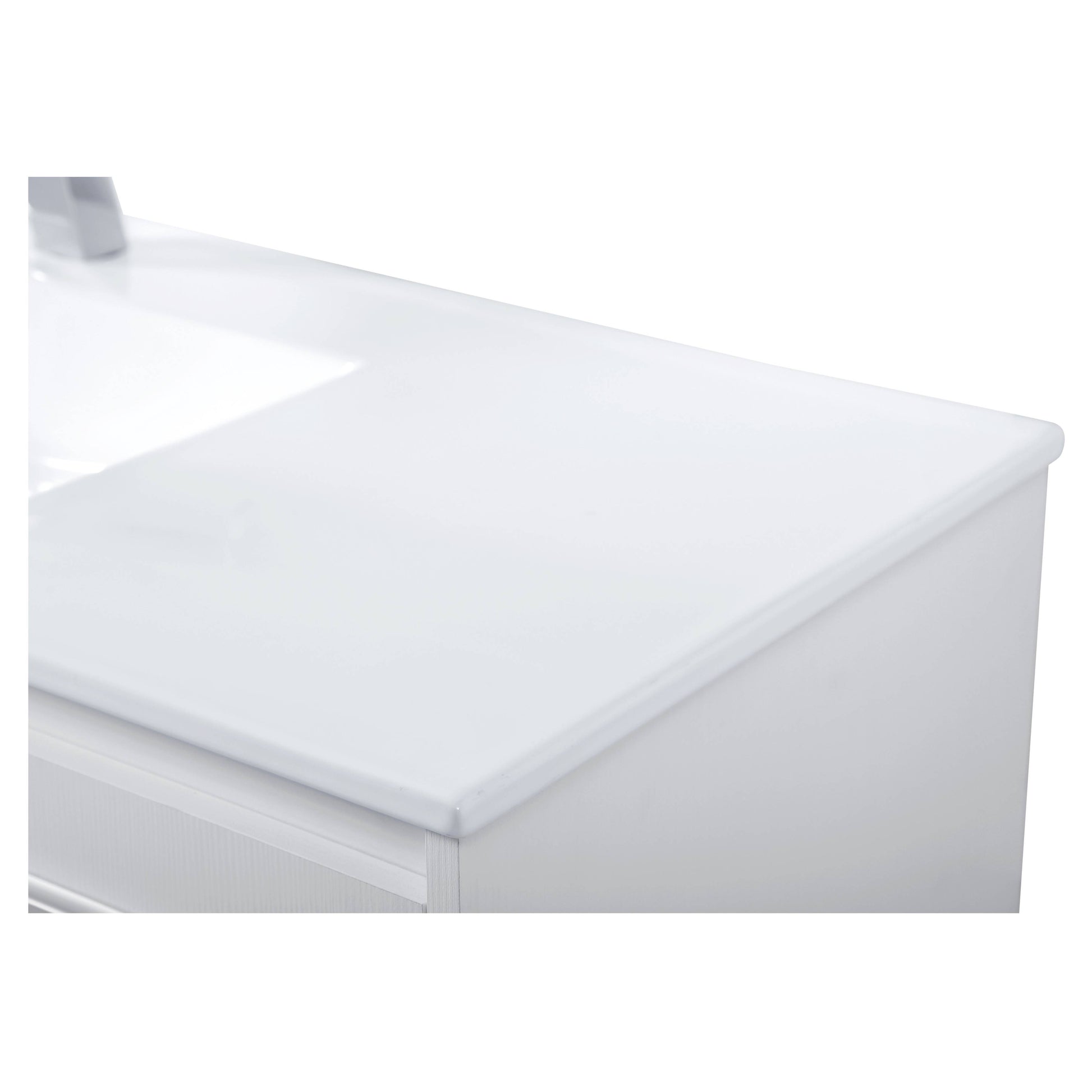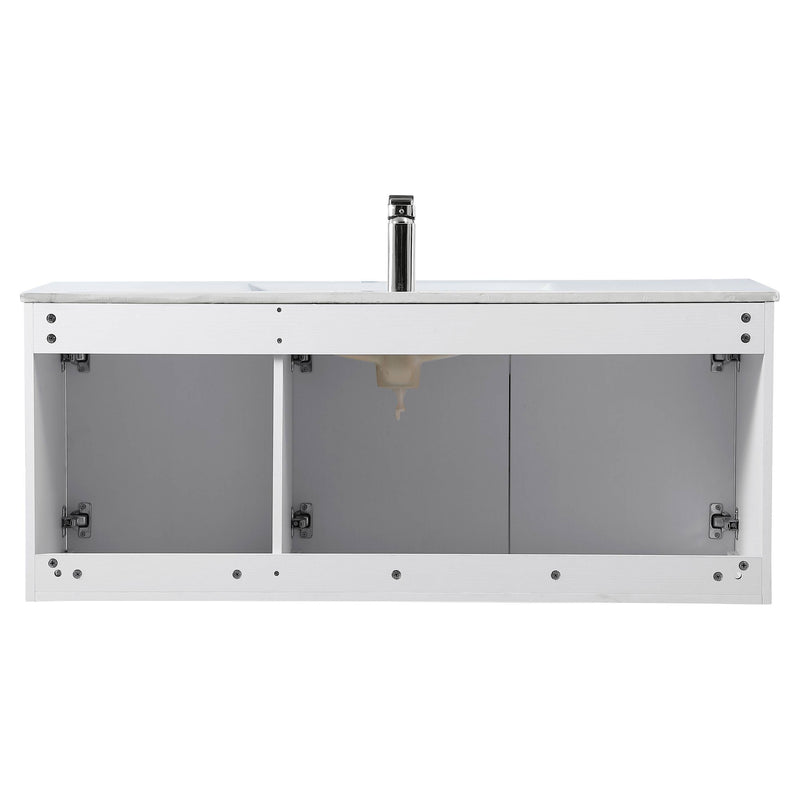 The contemporary simplicity of this 40" floating vanity in a white finish will help open the space and add stunning modern flair to your bathroom or powder room. The open space below makes it easy to show off your tiles and to clean the floor with ease--it's also the perfect place for a hamper. 3 doors open to reveal plentiful of storage pace to store all of your bathroom miscellany. The clean lines that permeate through the design will surely create a fresh look in your home.