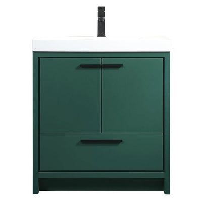 Modern sophistication is defined within the urbane green finish and black barpulls of this vanity. Its length makes it the perfect addition to any sized home, and saves space with its storage area hidden behind the double cabinet doors and one bottom drawers. Topped with a highly durable resin white counter top and an integrated sink, this modern design will add everlasting class to your bathroom and powder room.