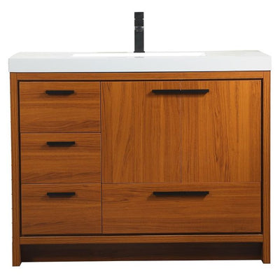 Modern sophistication is defined within the teak finish and black barpulls of this vanity. Its length makes it the perfect addition to any sized home, and saves space with its storage area hidden behind the double cabinet doors and one bottom drawers. Topped with a highly durable resin white counter top and an integrated sink, this modern design will add everlasting class to your bathroom and powder room.