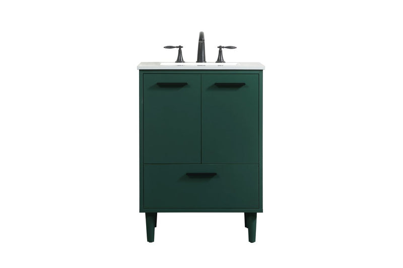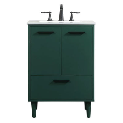 Modern sophistication is defined with the green finish and black barpulls of this vanity and slender tapered legs. Its length makes it the perfect addition to any sized home, and saves space with its storage area hidden behind the double cabinet doors and one bottom drawer. Topped with a highly durable engineered stone countertop and a porcelain undermount sink, this modern design will become your focal point of your bathroom or powder room. Equipped with soft-closing drawer and doors adds a quiet functional touch.
