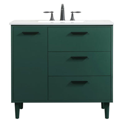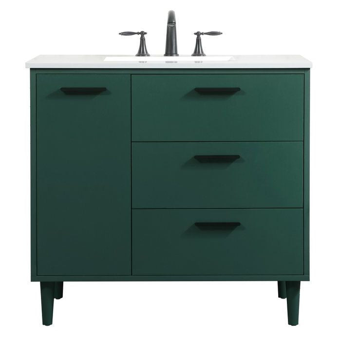 Modern sophistication is defined with the green finish and black barpulls of this vanity and slender tapered legs. Its length makes it the perfect addition to any sized home, and saves space with its storage area hidden behind the single cabinet door and two bottom drawers. Topped with a highly durable engineered stone countertop and a porcelain undermount sink, this modern design will become your focal point of your bathroom or powder room. Equipped with soft-closing drawer and doors adds a quiet functional touch.