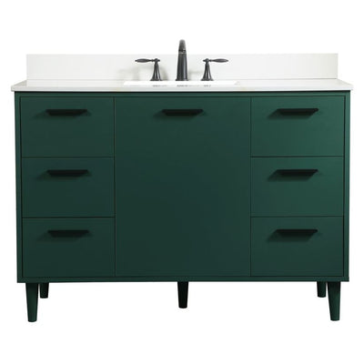 Modern sophistication is defined with the green finish and black barpulls of this vanity and slender tapered legs. Its length makes it the perfect addition to any sized home, and saves space with its storage area hidden behind the single cabinet door and six drawers. Topped with a highly durable engineered stone countertop and a porcelain undermount sink, this modern design will become your focal point of your bathroom. Comes with a matching backsplash to complete the look and protects your wall. Equipped with soft-closing drawer and doors adds a quiet functional touch.