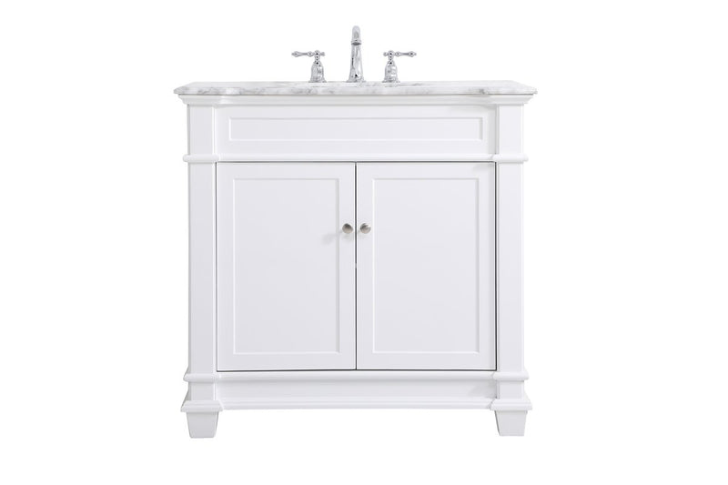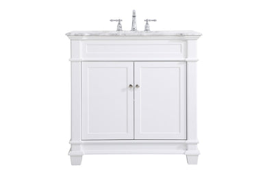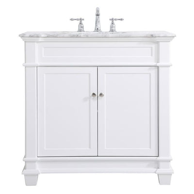 The Wesley Collection vanity cabinet will bring a settle pop of color into your bathroom. The white finish is a sophisticated color which creates a calming atmosphere in the room. The brushed nickel knobs bring a vibrant touch to balance the vanity. With the detailed engravings, the cabinet catches eyes with its beautiful lining work. Open the cabinet doors to store what you desire and make use of the spacious area. To top it off, the Carrara white marble adds a luxury and modern finish to the countertop."