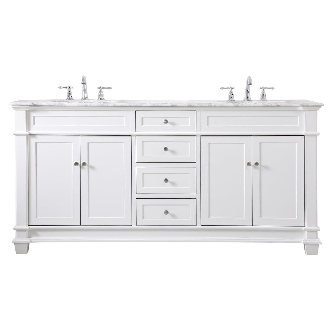 The Wesley Collection vanity cabinet will bring a settle pop of color into your bathroom. The white finish is a sophisticated color which creates a calming atmosphere in the room. The brushed nickel knobs bring a vibrant touch to balance the vanity. With the detailed engravings, the cabinet catches eyes with its beautiful lining work. Open the cabinet doors to store what you desire and make use of the spacious area. To top it off, the Carrara white marble adds a luxury and modern finish to the countertop.