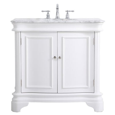 The Kameron Collection vanity cabinet is a monochrome piece that will give a minimalistic and clean finish in your bathroom. The white color is simple but refreshing to the eyes. To add a sleek touch, the silver accents from the knobs compliments the white cabinets. The countertop is Carrara white marble, which incorporates both the white and silver colors that is seamless and luxurious. Underneath the countertop are the doors to storage area where you can store away items and close off to have that minimal look.
