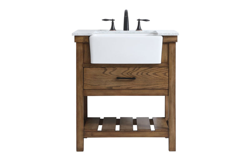 Make the most of your space with this farmhouse style bathroom vanity. Complements well with its beautiful finish, carrara white marble countertop, and the contemporary slender handle bar that sits on the functional drawers with soft closing mechanism, allowing you to store an assortment of bathroom essentials. The lower shelf makes it the perfect space to hold new towels for your guests. This stylish vanity ensures both form and function in your bathroom for you and your guests.