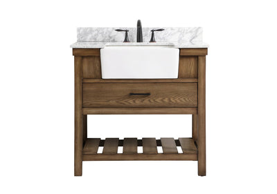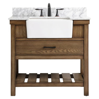 Make the most of your space with this farmhouse style bathroom vanity. Complements well with its beautiful finish, carrara white marble countertop, and the contemporary slender handle bar that sits on the functional drawers with soft closing mechanism, allowing you to store an assortment of bathroom essentials. The lower shelf makes it the perfect space to hold new towels for your guests. This stylish vanity ensures both form and function in your bathroom for you and your guests. Comes with a matching backsplash to complete the look and protects your wall.