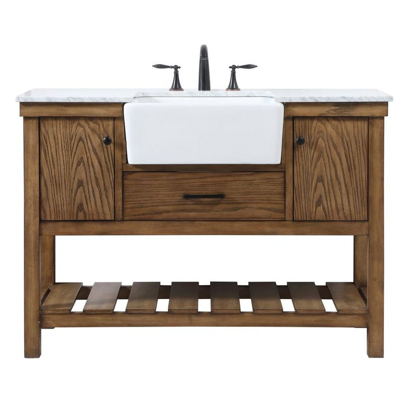 Make the most of your space with this farmhouse style bathroom vanity. Complements well with its beautiful finish, carrara white marble countertop, and the contemporary slender handle bar that sits on the functional drawers with soft closing mechanism, allowing you to store an assortment of bathroom essentials. The lower shelf makes it the perfect space to hold new towels for your guests. This stylish vanity ensures both form and function in your bathroom for you and your guests.