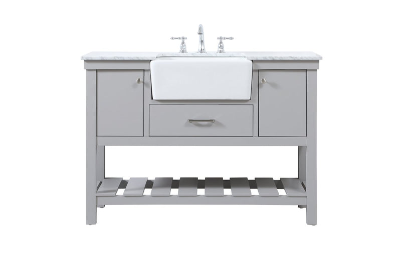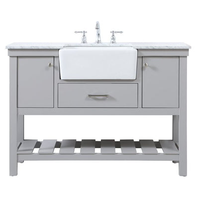 Make the most of your space with this farmhouse style bathroom vanity. Complements well with its beautiful finish, carrara white marble countertop, and the contemporary slender handle bar that sits on the functional drawers with soft closing mechanism, allowing you to store an assortment of bathroom essentials. The lower shelf makes it the perfect space to hold new towels for your guests. This stylish vanity ensures both form and function in your bathroom for you and your guests.
