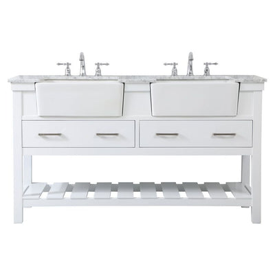 - Includes an apron porcelain sink and durable marble stone top in carrara white finish