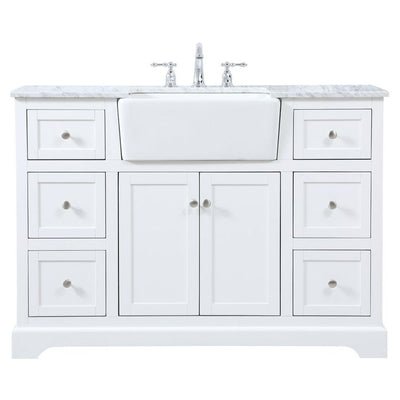 - Includes an apron porcelain sink and durable marble stone top in carrara white finish