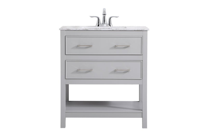 Elegance and sophistication go hand-in-hand with this stunning vanity 30" vanity. The rich grey finish is beautifully complimented by the dazzling brushed nickel hardware. The two drawers extend out to reveal U-drawers--perfect for storing away any bathroom toiletries, and the exposed shelf at the base allows for more storage space. Create an aura of refined taste in your bathroom or powder room.