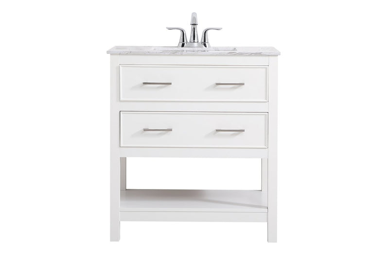 Elegance and sophistication go hand-in-hand with this stunning vanity 30" vanity. The rich white finish is beautifully complimented by the dazzling brushed nickel hardware. The two drawers extend out to reveal U-drawers--perfect for storing away any bathroom toiletries, and the exposed shelf at the base allows for more storage space. Create an aura of refined taste in your bathroom or powder room.