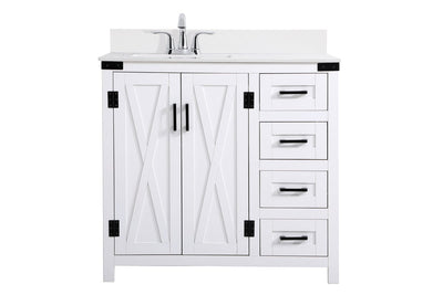The Grant Collection 36 in. vanity is a practical and stylish upgrade for your bathroom. Its white finish is highlighted by the engineered white stone top featuring an under-counter rectangular sink. The cross patterned cabinet doors are decorated with bold black hinges and bar pulls. The cabinet has four pullout drawers, ideal for towels, washcloths and bath accessories Comes with a matching backsplash to complete the look and protects your wall.
