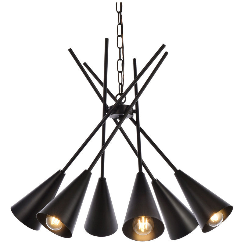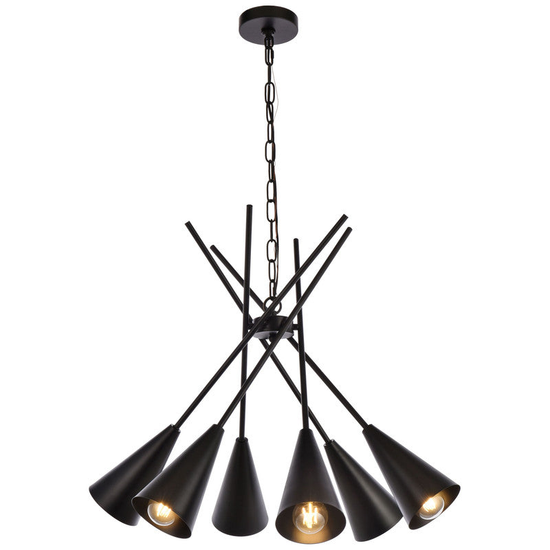 Greet guests with a warm and welcoming glow in the entryway or dress up your dining room for an upcoming dinner party with this eye-catching chandelier. Sure to make a statement in any setting, it is a metal frame takes on a sputnik-inspired silhouette with bursting rays of downward cone shades. Six lights are distributed throughout, each exposed to create an even gleam. Installation is required for this hardwired dimmable fixture. Rods are adjustable to the desired height.