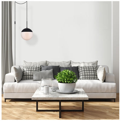 Refined style with a practical design, Eclipse plug in pendant lamps bring cosmopolitan sophistication anywhere, especially to an entryway, office, bathroom, bedroom, or kitchen. The smooth iron round frame comes in a black finish. A 15 foot black cord allows you to vary the hanging height off the swag hooks. Since this is a plug-in you can move it around easily to add light wherever you go. A touch of color on top of the frosted white spherical glass shade brings character to this classic style. Living in the big city has never been this easy. Simply hang this piece on the provided swag hooks and plug it in for an effortlessly easy installation - can be hung from a sloped or vaulted ceiling.