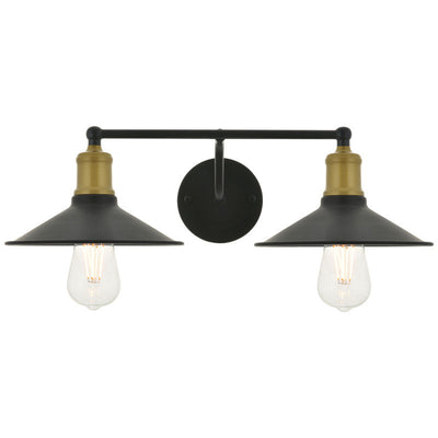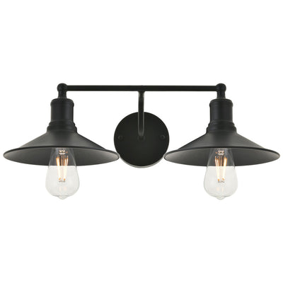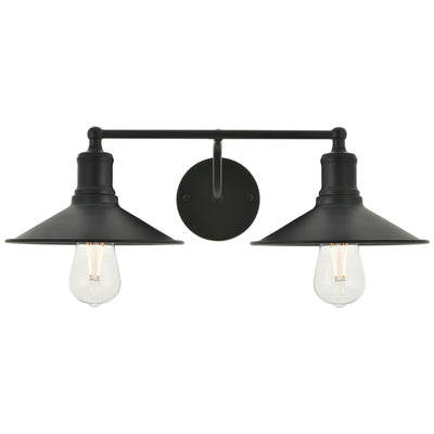 - Black finish 2-light wall sconce with a curved arm and cone shaped shade