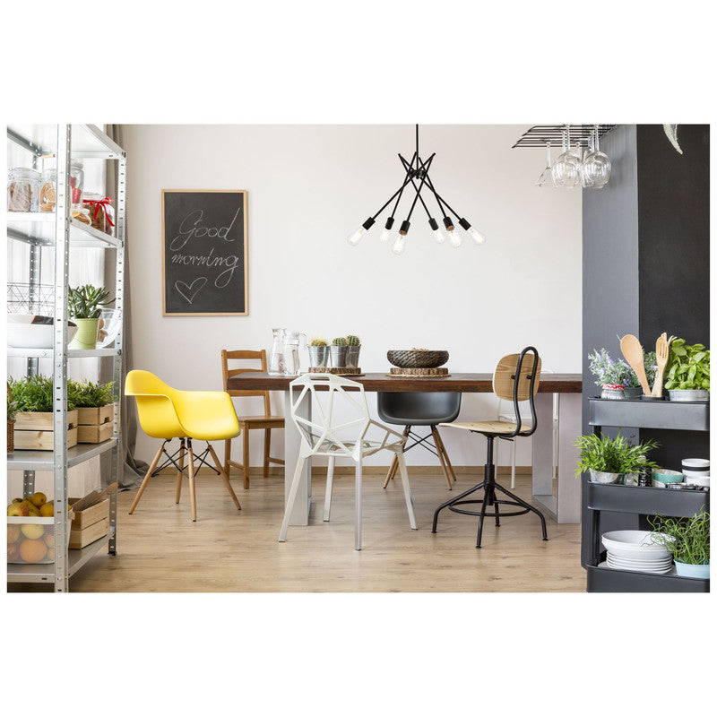 Greet guests with a warm and welcoming glow in the entryway or dress up your dining room for an upcoming dinner party with this eye-catching chandelier. Sure to make a statement in any setting, it is a metal frame takes on a sputnik-inspired silhouette with bursting rays of downward lighting. Six lights are distributed throughout, each exposed to create an even gleam. Installation is required for this hardwired dimmable fixture. Rods are adjustable to the desired height.