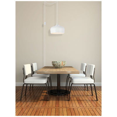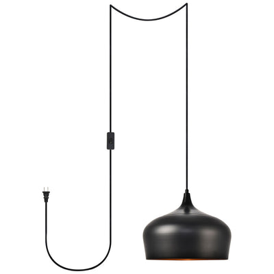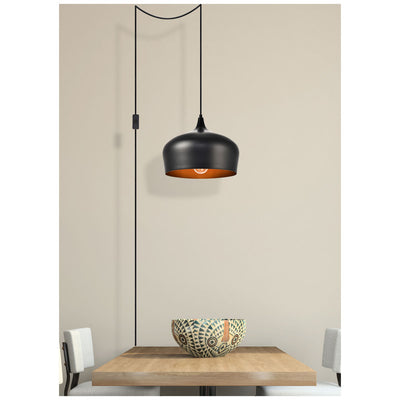 Set the right mood in a kitchen, office, or bedroom with Nora collection hanging lights. Sleek chalice shaped aluminum shades come in a sexy matte-black finish. Contrasting vintage brass finish on the inside of the shade gives these pendant lamps just the right amount of attitude. Plug-in design for easy access lighting with built-in on/off switch. Simply hang this piece on the provided swag hooks and plug it in for an effortlessly easy installation - can be hung from a sloped or vaulted ceiling.