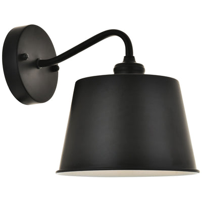 - Contemporary and minimalistic black finish wall sconce with a drum shaped shade and gentle curving arm