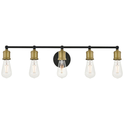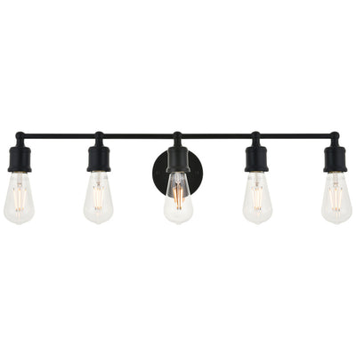 - Black finish 5-light wall sconce with an undulating arm and circular back plate