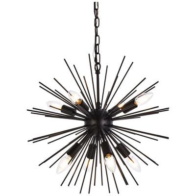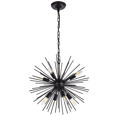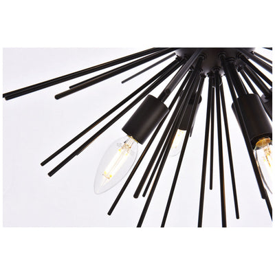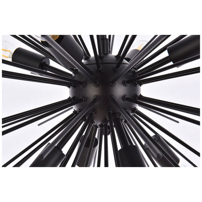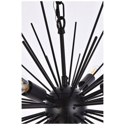 - Black finish pendant with 8 lights and a myriad of black finish rods extending from center