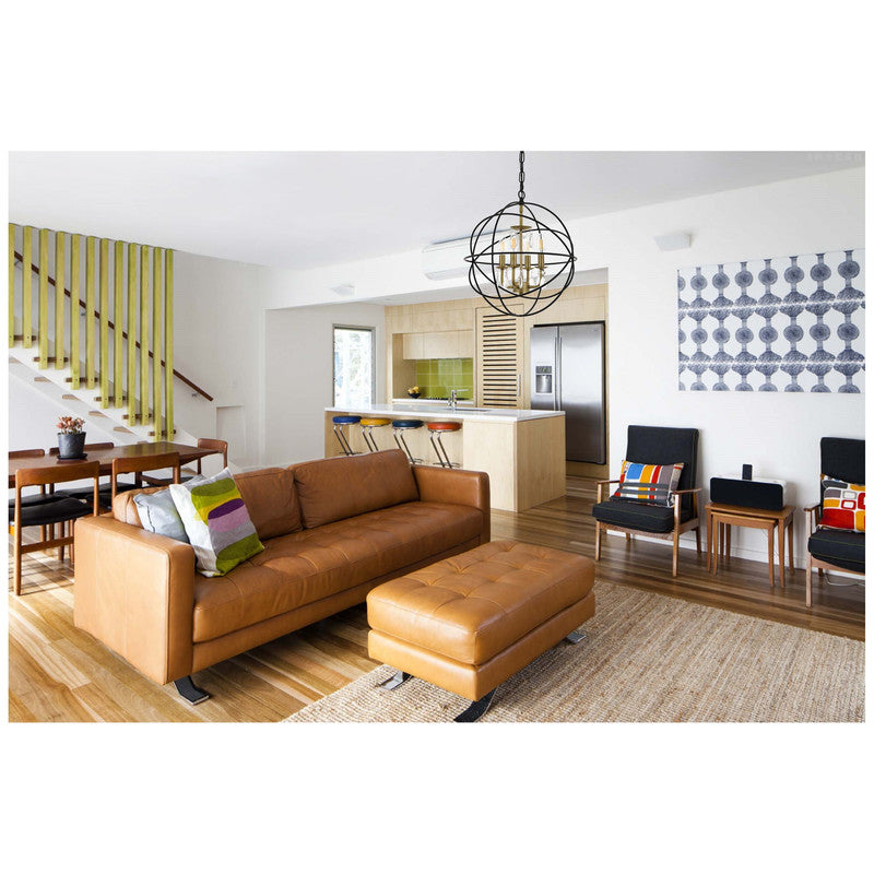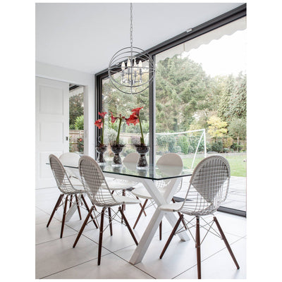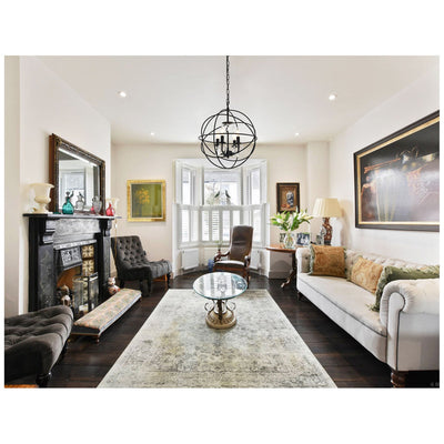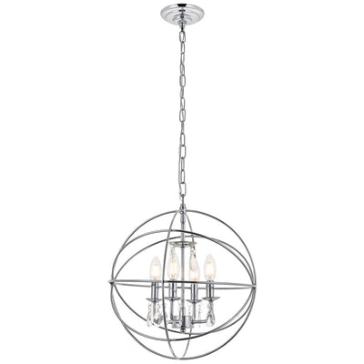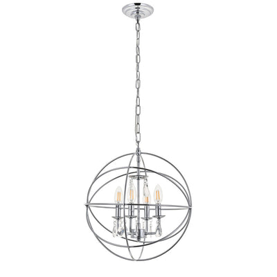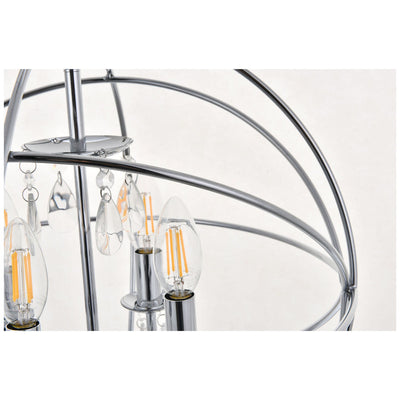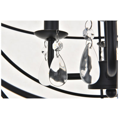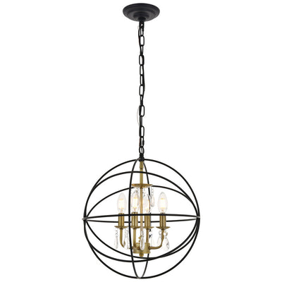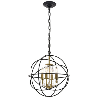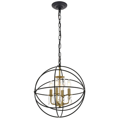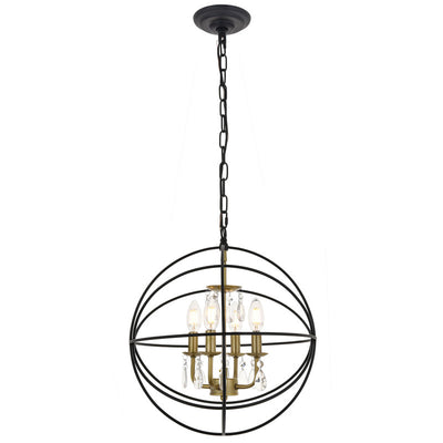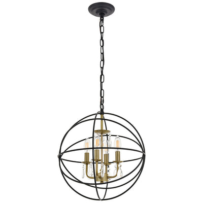 - Two-toned brass and black finish open gyroscopic frame with suspended crystals hanging from the bobeche, offering a stylish old world charm