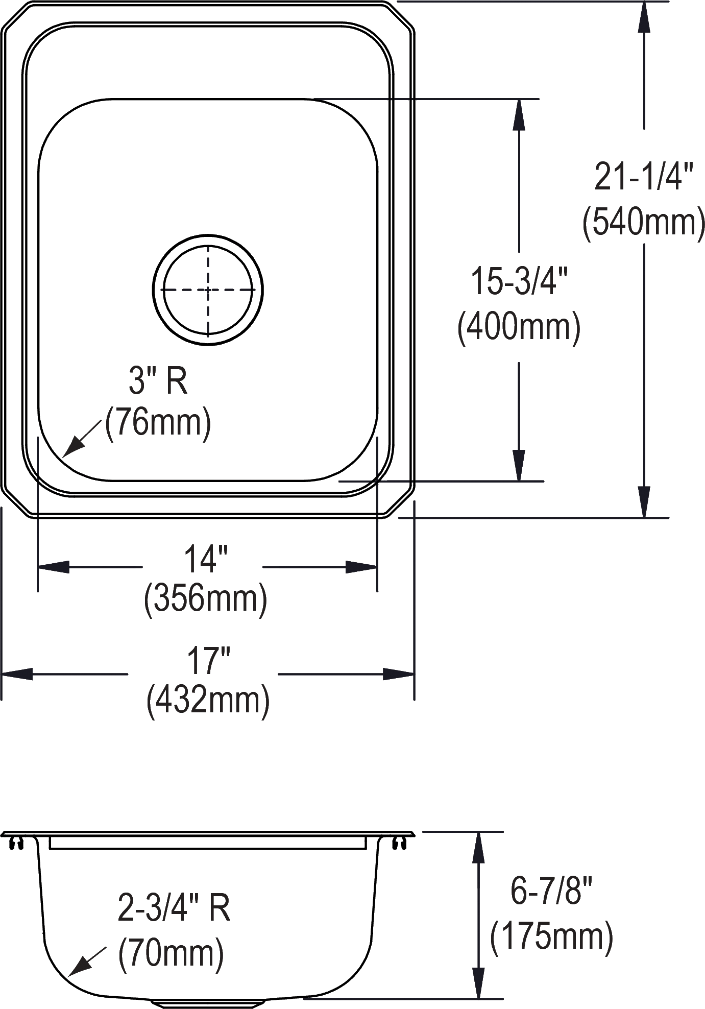 - CENTER DRAIN: Drain is conveniently placed in the center of the sink.